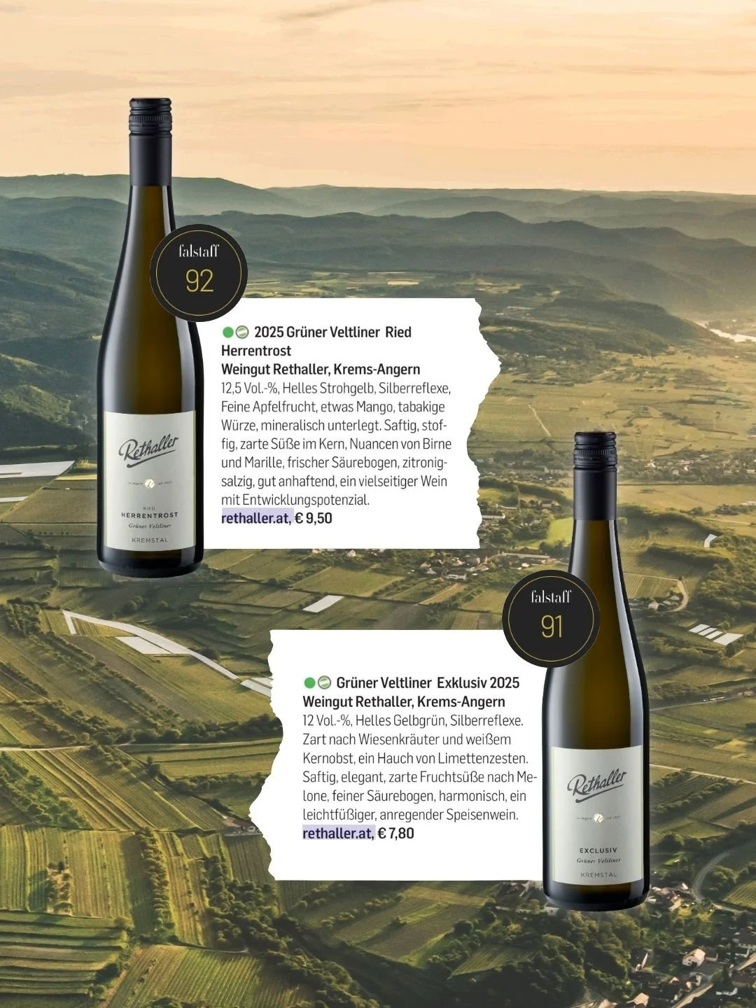 Beim Falstaff DAC Cup erreichte unser Grüner Veltliner Herrentrost 92 Punkte, der Grüne Veltliner Exclusiv wurde mit 91 Punkten prämiert. Auch bei der HENRIS Frühlingsweinverkostung konnten unser Zweigelt Rosé und der Gelbe Muskateller mit tollen Bewertungen glänzen.